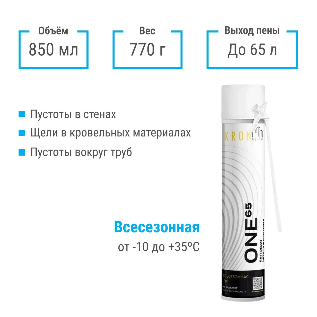 Пена монтажная KRONbuild ONE 65 идеально подходит для применения в любое время года и температуре окружающей среды от -10°С до +35°С.