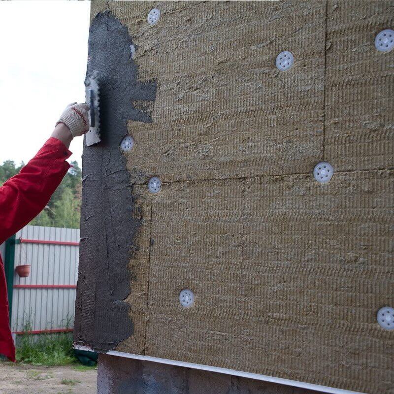 Теплоизоляционные плиты сначала крепят к стене, после чего фиксируют их дюбелями.