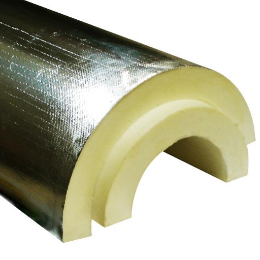 Полиуретановые скорлупы плотностью 100 кг/м3 длиной 400–828 мм с покрытием из алюминиевой фольги.