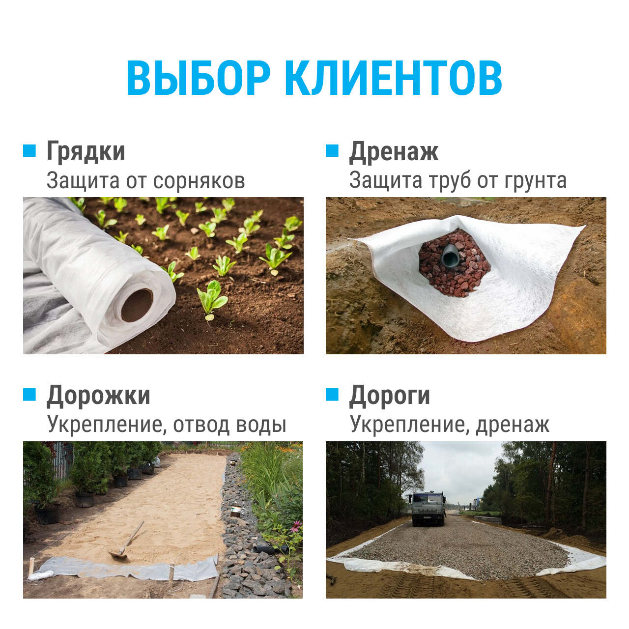 Основные функции — препятствует росту сорняков, разделяет слои, укрепляет грунт, отводит воду, используется при организации дренажных систем как фильтрующий слой.