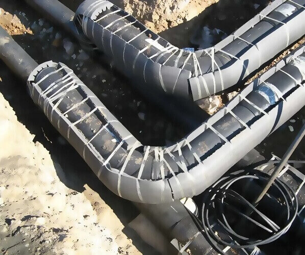 Материал демпфирует и устраняет механические повреждения трубопроводов в пенополиуретановой изоляции и компенсаторов — мест поворотов труб.