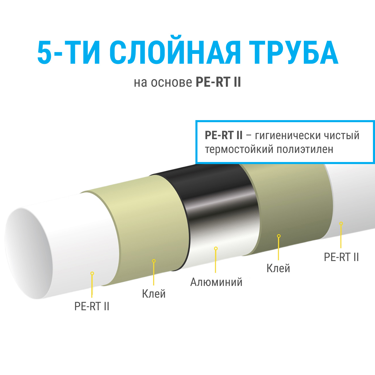 Состоит из 5-ти слоёв: 2-х слоёв полиэтилена PE-RT тип II, 1-го слоя алюминия и 2-х слоёв клеевого высокопрочного соединения.