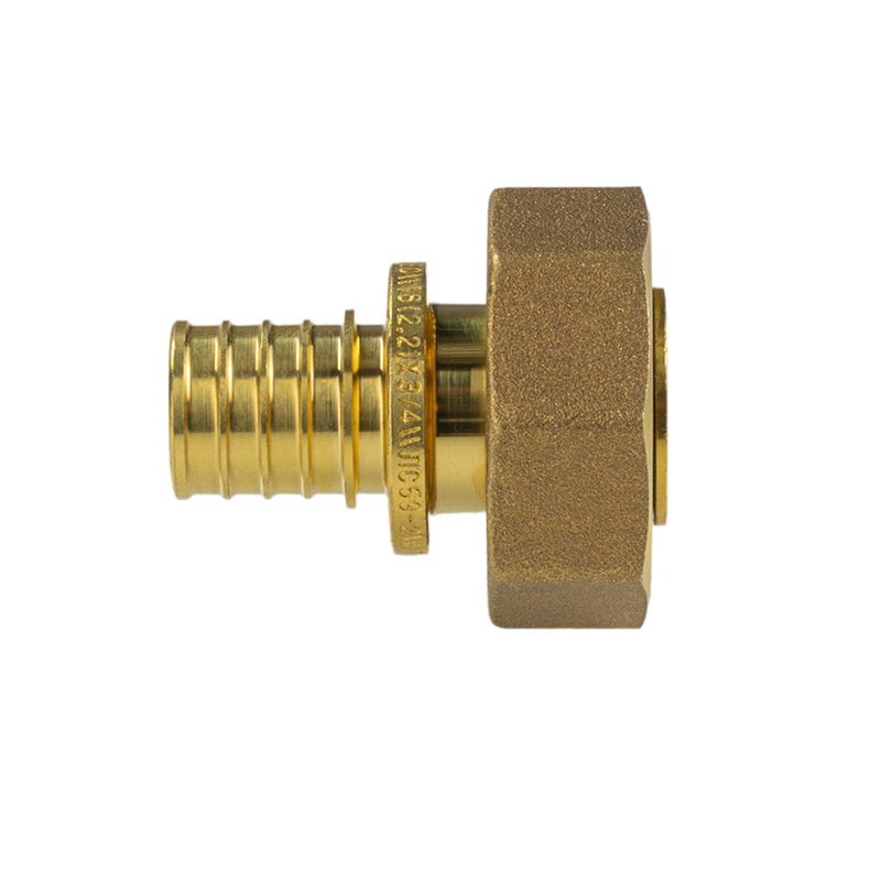 Аксиальный латунный фитинг для создания разъёмного соединения полимерных труб PE-X или PE-RT c патрубками сантехнических устройств с наружной резьбой стандарта евроконус.
