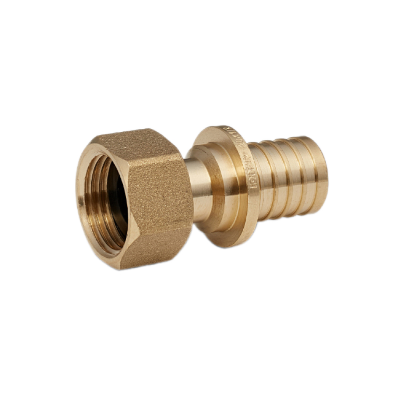 Надвижной латунный фитинг для создания разъёмного соединения полимерных труб PE-X или PE-RT c патрубками сантехнических устройств с наружной резьбой.