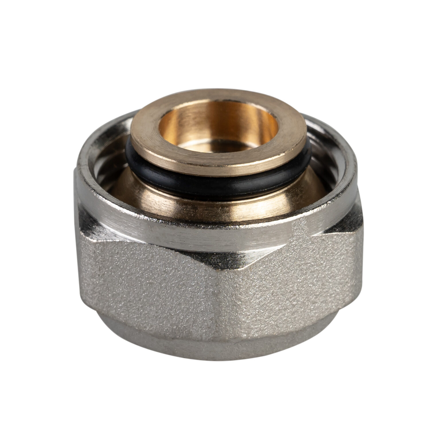 В месте соприкосновения с трубой оснащён тефлоновым защитным кольцом, которое исключает гальванический контакт между алюминиевым слоем трубы и латунным фитингом.