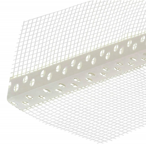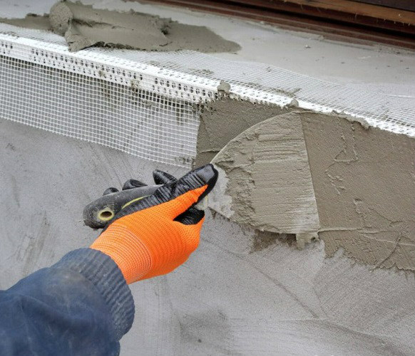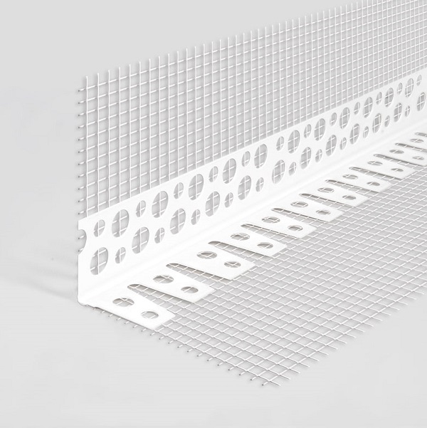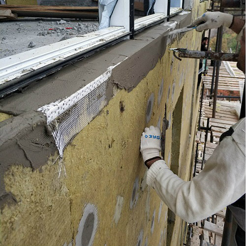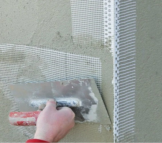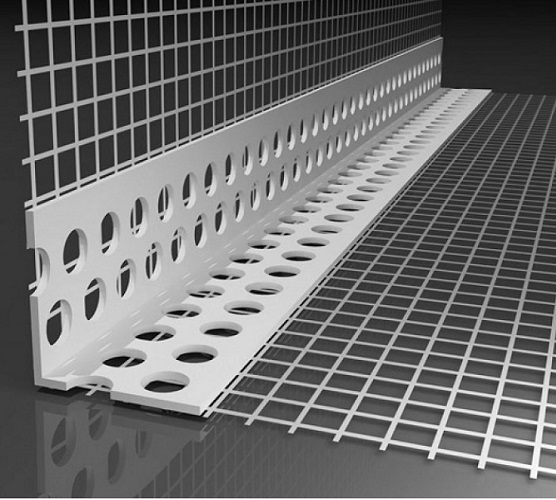 Угловой профиль из поливинилхлорида с армирующей сеткой с двух сторон крепят к углам теплоизоляционных плит поверх штукатурного слоя.