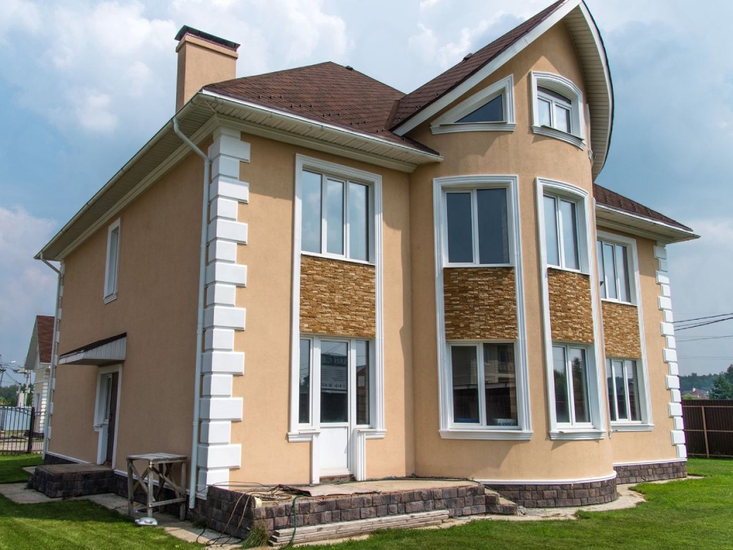 Декоративная отделка фасада выполняется тонкослойными штукатурками.