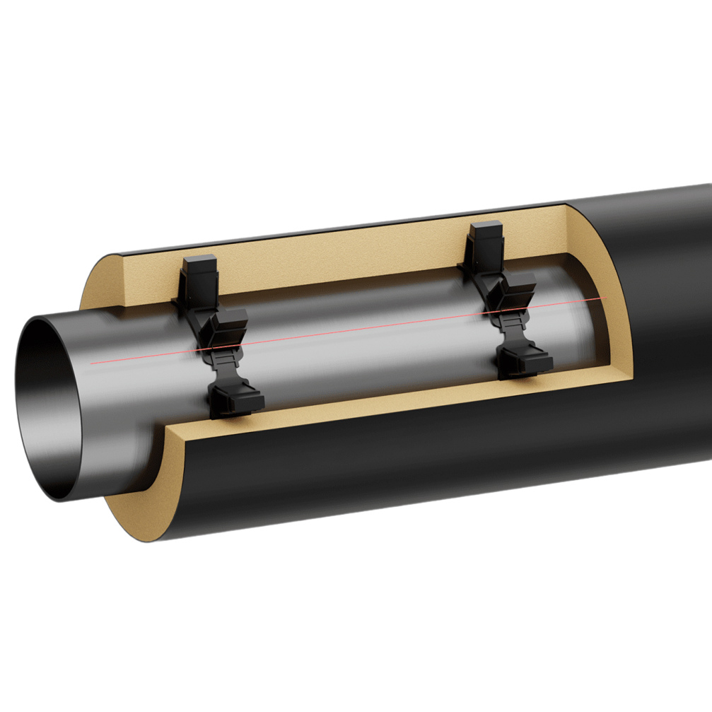 Пространство между электросварной стальной трубой, которая транспортирует жидкость, и защитной оболочкой заполнено теплоизоляцией из пенополиуретана.