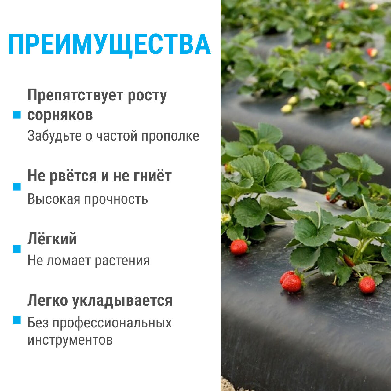 Главные функции — препятствует росту сорняков на грядках, защищает клубнику от мороза, солнца и соприкосновения ягод с почвой, они остаются чистыми и сухими.